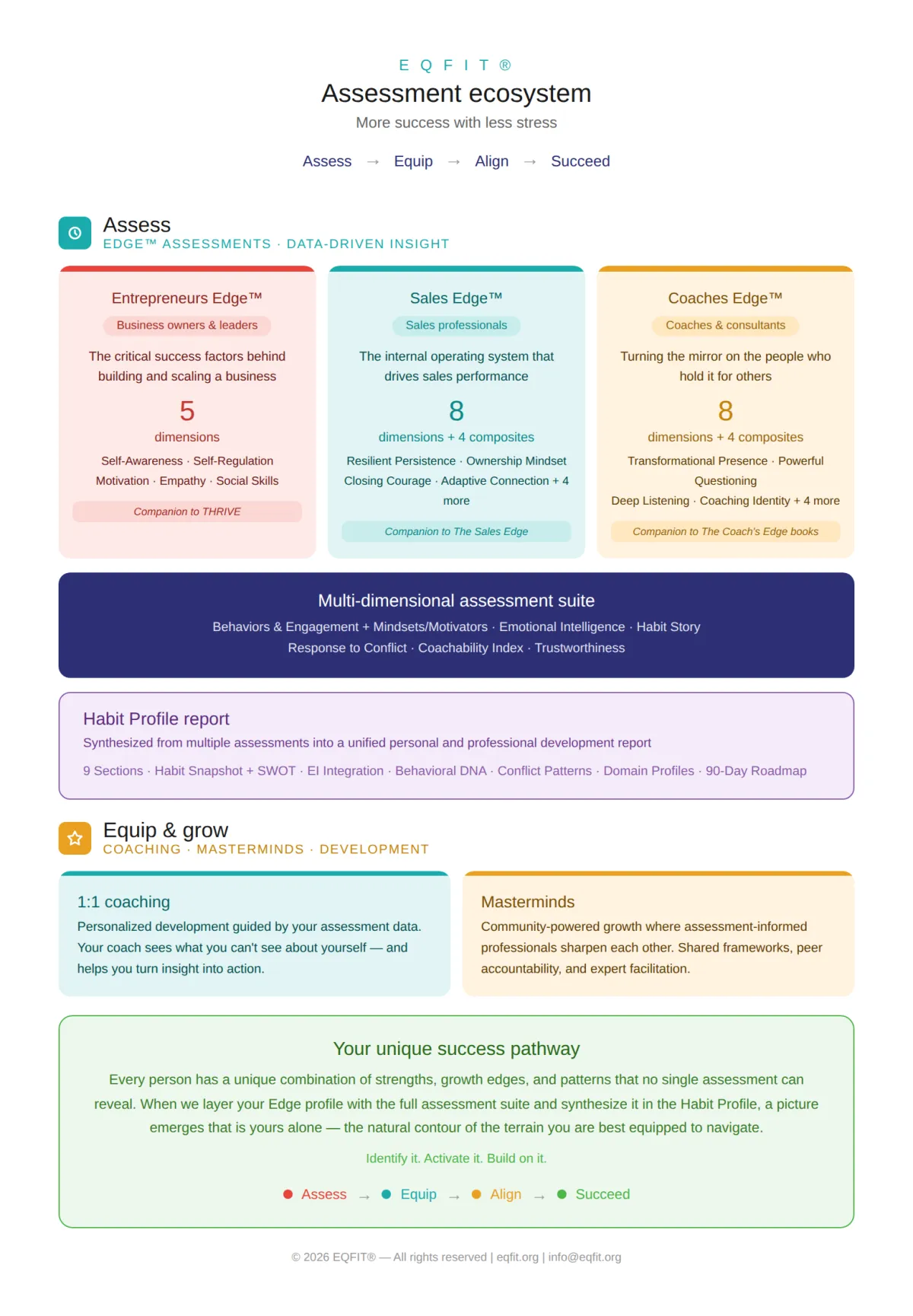 What the ecosystem actually is: The EQFIT® Ecosystem is a complete system of assessments, books, coaching, community, and technology — all built on a single framework: Assess, Equip, Align, Succeed. It starts with data, not guesswork. Our proprietary Edge™ Assessments use scenario-based methodology grounded in emotional intelligence and neuroscience to reveal the patterns that are running beneath the surface of your professional life. From there, our books provide the frameworks, our coaching provides the guidance, and our communities — the EQFIT® Alliance and the Coaches Edge™ Mastermind — provide the environment where growth becomes sustainable. Every piece of the ecosystem connects. Assessments inform coaching. Coaching reinforces what the books teach. Community keeps you accountable. Technology makes it scale. Nothing operates in isolation because you don't operate in isolation.